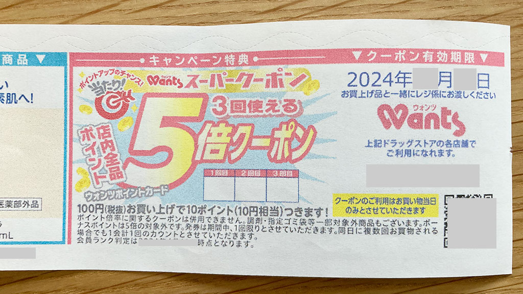 「ウォンツ スーパークーポンキャンペーン」が始まると、その月 最初の会計が終わった直後に5倍クーポンが発行される可能性が極めて高いです。